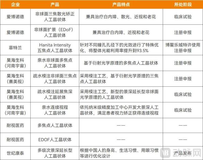 爱博诺德、昊海生科、河南宇宙、赛美视、耐视医药等国内企业也已布局三焦点或EDOF人工晶体,最快已进入产品注册阶段。