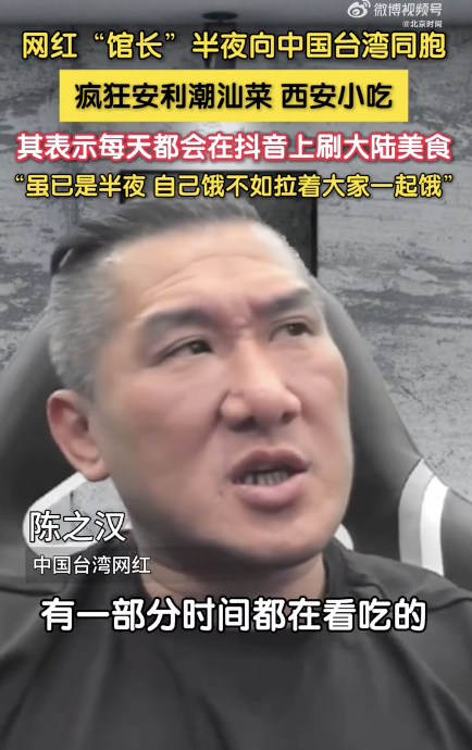 “馆长”半夜安利潮汕菜和西安小吃。9月7日晚,中国台湾网红“馆长”半夜向同胞们疯狂安利潮汕菜、西安小吃,其表示每天都会在抖音上刷大陆美食,虽已是半夜,自己饿不如拉着大家一起饿。