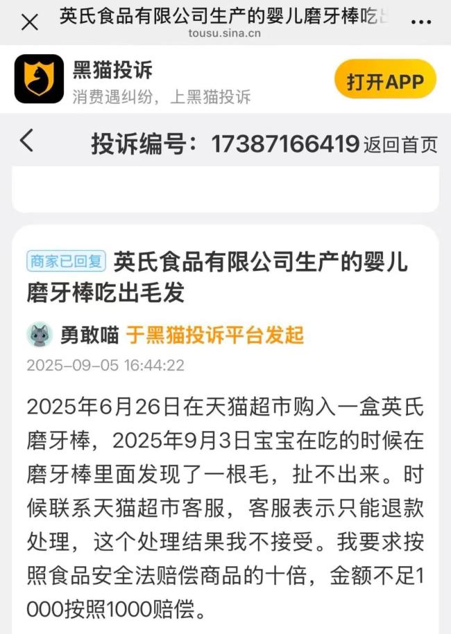 今年1月份,有消费者投诉英氏婴儿米粉里有蚊子;今年6月,有用户投诉天猫超市英氏鳕鱼肠吃出异物;8月5日,有用户投诉京东买的英氏磨牙棒未到保质期竟发霉带铁丝;在8月中旬媒体陆续报道后的8月18日,又有用户反映,购买的英氏盒装9小袋吃到第五袋的时候发现里里面有个小虫子;8月29日,又有用户反映英氏二阶米粉里面有异物;9月5日,有有消费者投诉英氏磨牙棒里面吃出毛发,且扯不出来……