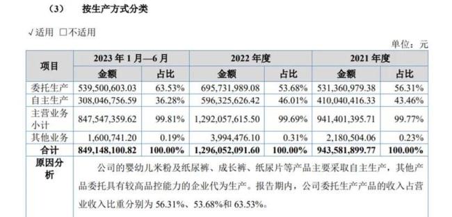 2023年提交的公开转让说明书,英氏公布了2021、2022、2023年1-6月份的财务情况,其委托生产产品收入占营收比重均过半,分别为56.31%、53.68%和63.53%。