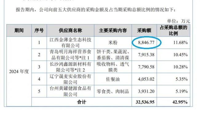 在英氏的五大供应商里,位居第一位的也正是米粉代工厂江西金薄金生态科技有限公司,只是令人疑惑的是,英氏公布2024年向该代工厂采购米粉金额为8846.77万元(不含税)。显然这一数据与上述8842.84万元并非一致。