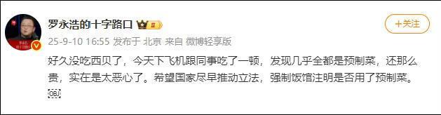 罗永浩在社交媒体上批评西贝的菜品几乎全是预制菜且价格昂贵,呼吁国家推动立法强制餐馆注明是否使用了预制菜。这一言论再次引发了公众对预制菜的关注。