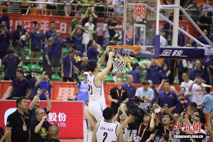 图为球员柳锐代表湘钢集团队剪下篮网。 周阳 摄
