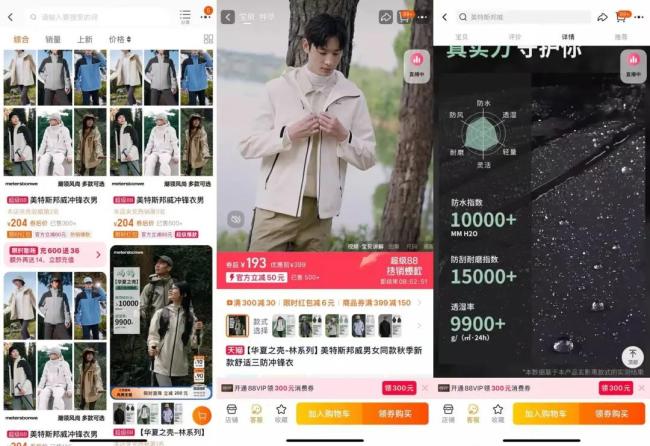 从价格看,美邦的确做到了平替。美邦天猫旗舰店中,销量最好的冲锋衣是售价193元的“华夏之壳-林系列”,页面显示共售出超500件。不过,该款冲锋衣的面料里料均为100%聚酯纤维,防水指数为10000+mmH₂O。这个水平可以应对日常通勤,但难以满足专业户外活动的需求(专业暴雨级防水指数通常在20000mmH₂O以上)。