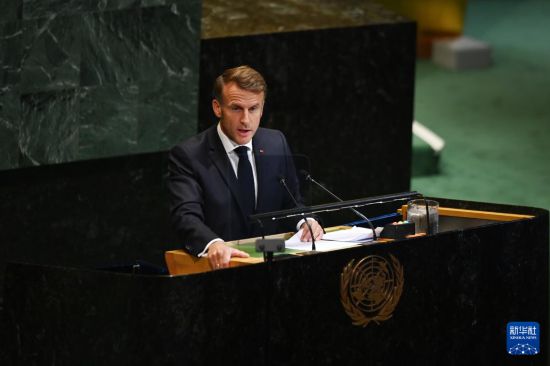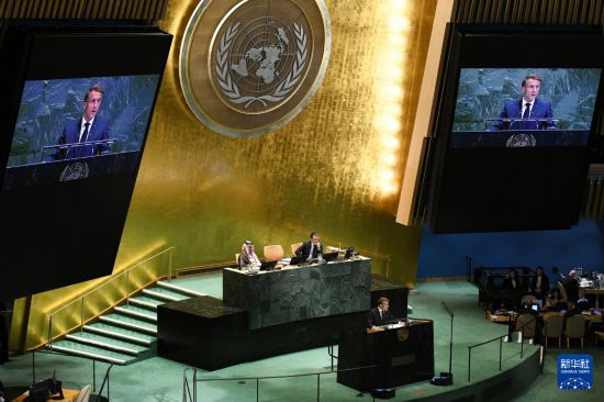 9月22日,在位于纽约的联合国总部,法国总统马克龙在和平解决巴勒斯坦问题和落实“两国方案”高级别国际会议上讲话。新华社记者 李睿 摄