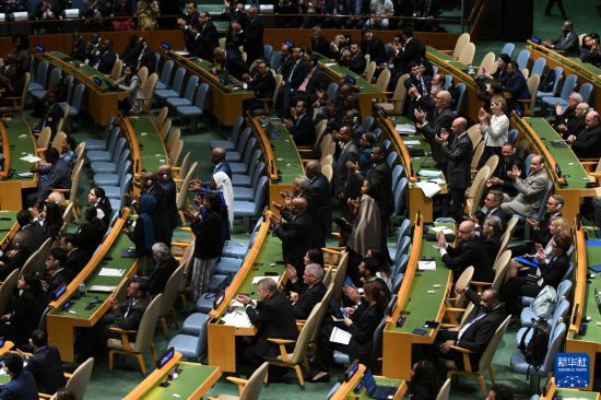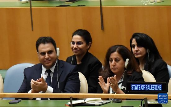 9月22日,在位于纽约的联合国总部举行的和平解决巴勒斯坦问题和落实“两国方案”高级别国际会议上,巴勒斯坦代表为与会领导人发言鼓掌。新华社记者 李睿 摄
