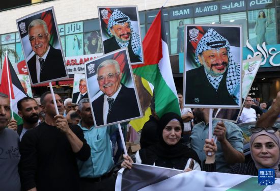 9月23日,在约旦河西岸城市纳布卢斯,民众挥舞巴勒斯坦领导人阿拉法特和阿巴斯画像参加庆祝活动。新华社发(尼达尔·艾仕塔耶摄)