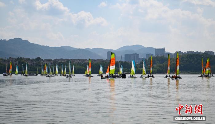 9月27日,众多帆船航行青山湖湖面上。当日,2025中国家庭帆船赛·杭州站在浙江杭州临安青山湖拉开帷幕,来自北京、上海、武汉等10个城市的40组家庭近百名选手在绿水青山间扬帆。中新社记者 王刚 摄