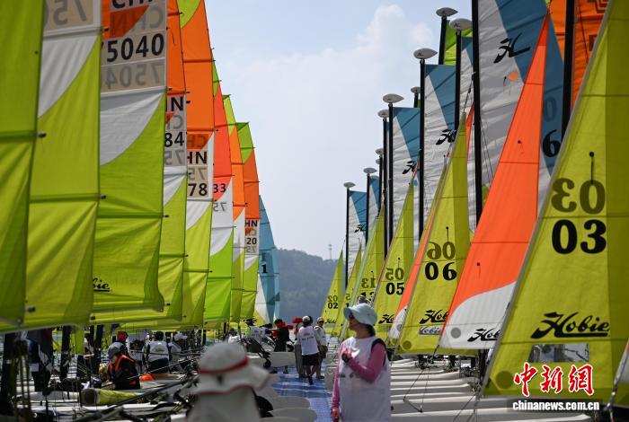 9月27日,众多帆船集结等待启航。当日,2025中国家庭帆船赛·杭州站在浙江杭州临安青山湖拉开帷幕,来自北京、上海、武汉等10个城市的40组家庭近百名选手在绿水青山间扬帆。中新社记者 王刚 摄
