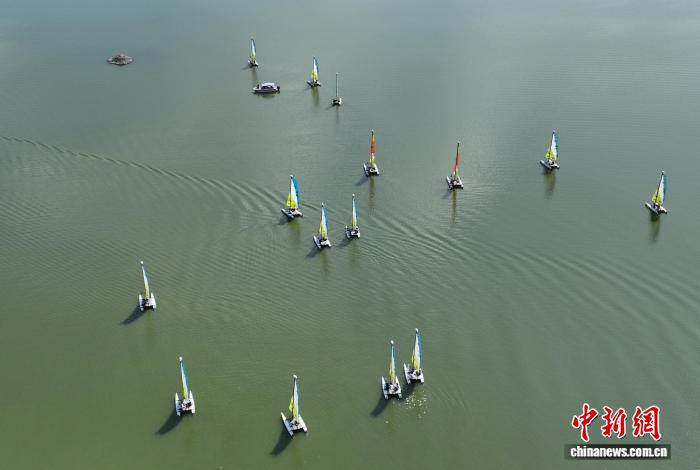 9月27日,航拍比赛现场。当日,2025中国家庭帆船赛·杭州站在浙江杭州临安青山湖拉开帷幕,来自北京、上海、武汉等10个城市的40组家庭近百名选手在绿水青山间扬帆。(无人机照片)中新社记者 王刚 摄