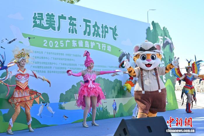 9月27日,2025年广东候鸟护飞行动启动仪式在位于广东省广州市的南沙湿地景区举行。本次活动以“绿美广东·万众护飞”为主题,近10家鸟类保护相关单位现场布展,通过打卡互动、公益课程体验、趣味鸟类科普小游戏等为民众科普野生鸟类保护法律法规和科学知识。图为启动仪式上的表演。中新社记者 陈楚红 摄