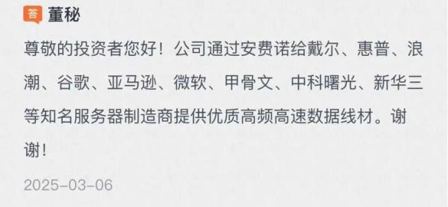 也是在年初,一家上市公司在互动易上透露,其通过全球连接器巨头安费诺,已成功进入戴尔、惠普、浪潮、谷歌、亚马逊、微软、甲骨文、中科曙光、新华三等知名服务器制造商提供优质高频高速数据线材。