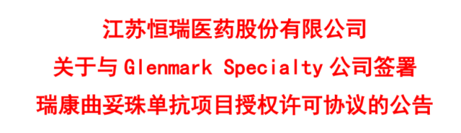 9月25日,恒瑞医药与Glenmark Specialty达成协议,将公司具有自主知识产权的1类创新药瑞康曲妥珠单抗(SHR-A1811)项目有偿许可给对方。