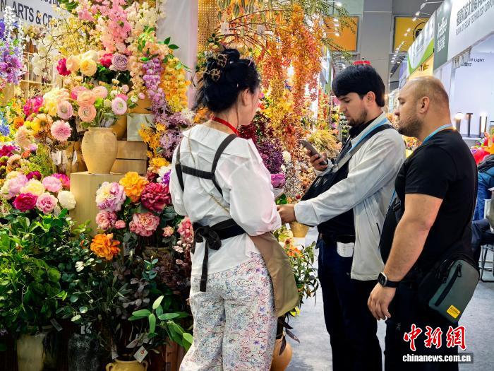 “这款花触摸上去像真的一样,是用什么材料做的?”在东莞市竟成工艺制品科技有限公司展位上,印尼采购商安通一边用卷尺测量花枝长度,一边了解产品细节。