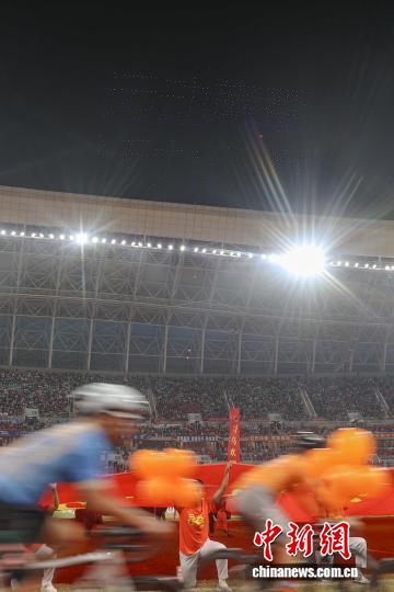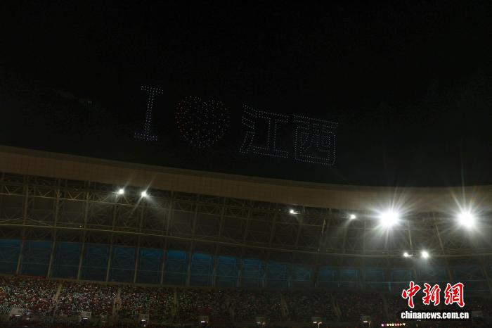 图为比赛开始前的,比赛场馆上空的无人机灯光秀拼出了“运动赣鄱 活力江西”的字样。中新社记者 刘力鑫 摄