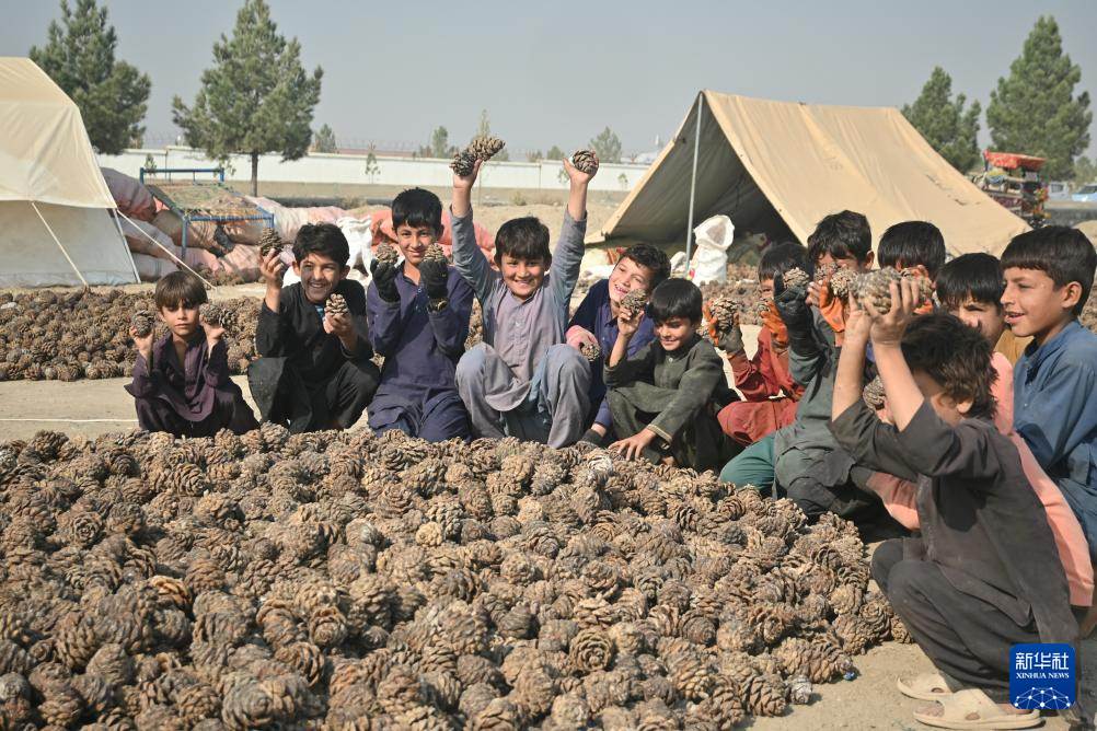 10月28日,在阿富汗霍斯特省的松子加工交易市场,当地儿童帮忙采集松子。 新华社记者 张艺缤 摄