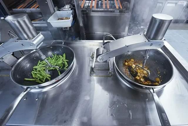 银色是后厨最常见的颜色。推开标着“后厨重地,闲人免进”的大门,料理台、菜柜、各种刀具都闪着银色的金属光泽。周沐洋是一名从业10年的厨师,在湘菜、江浙菜、校园食堂等不同餐厅工作过。去年春天,他在深圳的一家连锁餐厅工作时,见到了三台半人高的机器。每个滚筒里附带着三个“抓手”,模拟厨师们拿着锅铲、锅勺的手臂。只需选中要做的菜品,放入食材,机械臂和滚筒便开始交替做工。以一道辣椒炒肉为例,人类需要将切好的青椒段、猪肉片、葱姜蒜等材料放入原料盒,再将盐、味精等放入干料盒,最后在设定好的程序中选择“辣椒炒肉”,点击开始。接下来就是机器的表演。5分钟后,油亮的青红菜品上缓缓飘起白烟,这就是“锅气”。