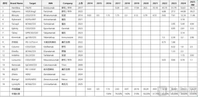 在血友病治疗领域,罗氏的Hemlibra就是一个典型的例子。传统的血友病治疗主要依赖于定期输注凝血因子,但这种方法存在诸多不便,且患者仍面临着出血风险。Hemlibra作为一款双抗药物,通过同时靶向FIX和FX,模拟了凝血因子VIII的功能,不仅大大降低了患者的出血次数,还显著改善了患者的生活质量。自2017年上市以来,Hemlibra的销售额一路飙升,2025年前三季度已达46.72亿美元,预计全年超过60亿美元,几乎占据了血友病治疗市场的半壁江山。