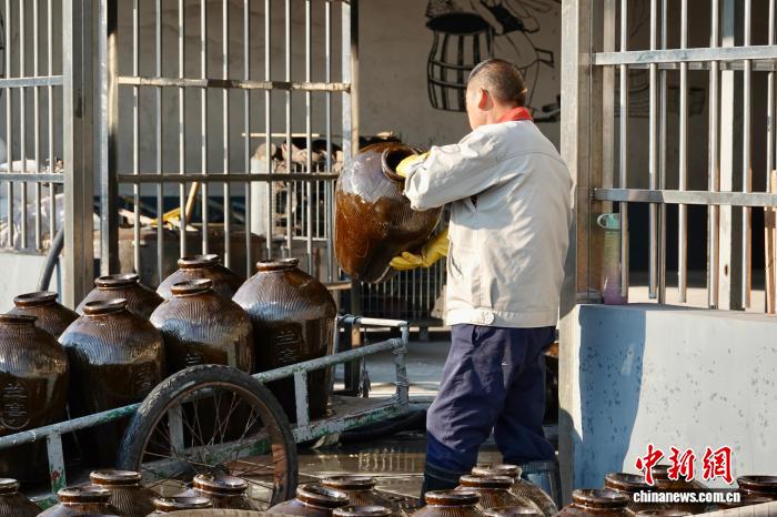 11月21日,酿酒师傅搬运酒坛。中新社记者 刘子琳 摄
