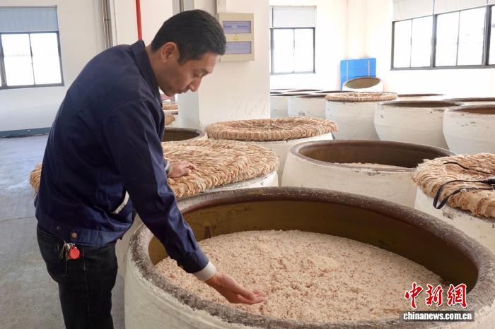 11月21日,酿酒师傅检查酒醪的发酵温度。中新社记者 刘子琳 摄