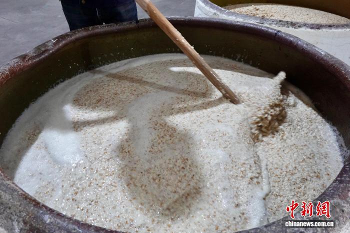 11月21日,正在进行开耙的酒醪。中新社记者 刘子琳 摄