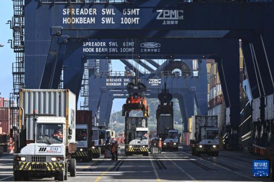 11月18日,在智利圣安东尼奥港,工人们正在进行装卸作业。新华社发(豪尔赫·比列加斯摄)