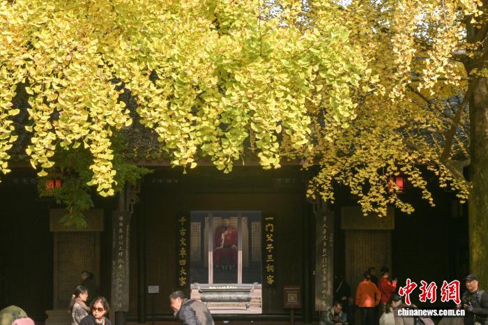 11月24日,初冬暖阳下,四川省眉山市东坡区纱縠行南街的三苏祠博物馆南门,高大的银杏树渐染金黄,金黄叶片随风轻舞,吸引不少游客驻足观赏、拍照留念,现场洋溢着浓浓的诗意与雅致氛围。图为三苏祠博物馆南门内外银杏树渐染金黄。中新社记者 刘忠俊 摄