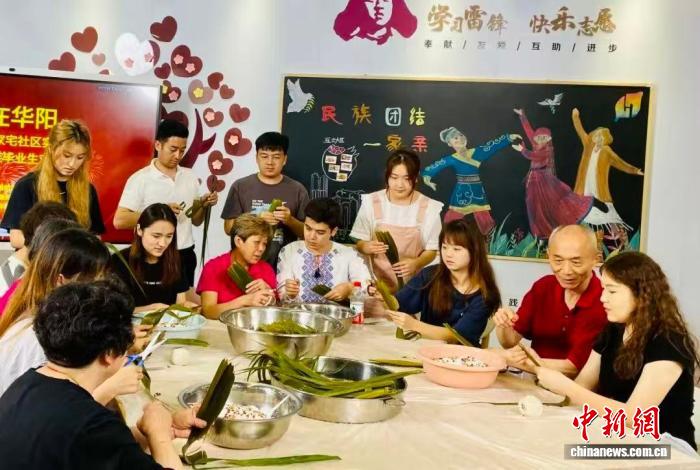 2023年端午佳节前,东华大学少数民族毕业生与华阳社区各民族同胞一起包粽子、共跳民族舞。上海市长宁区委统战部供图