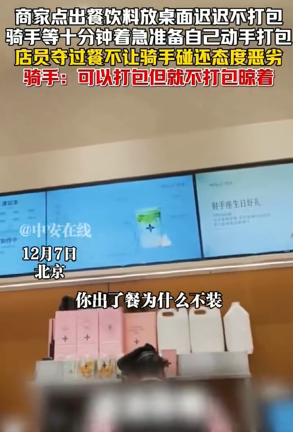 12月7日,一段发生在北京的外卖取餐纠纷视频在网络上引发关注。视频显示,一名外卖骑手按订单到店取餐后,发现餐品早已制作完成,却被放在操作台上迟迟未打包。骑手在现场等待将近十分钟,期间多次观察到餐已备好但无人处理,配送时间不断被压缩,情绪逐渐焦急。