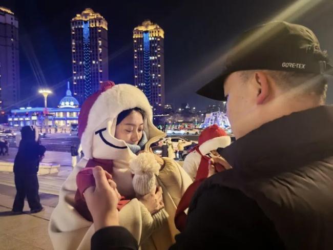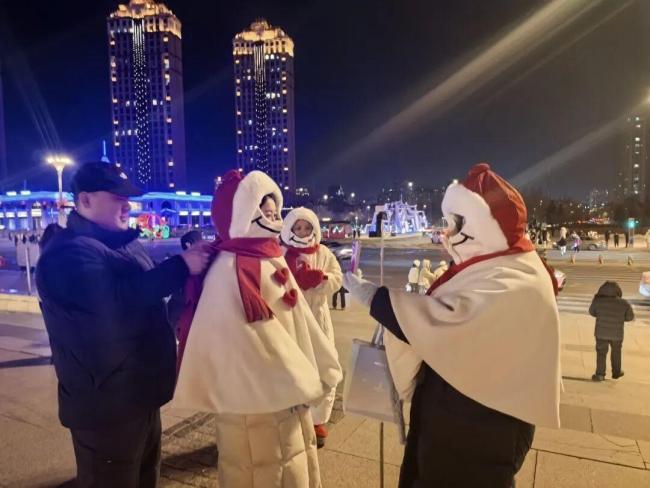 2日晚,哈尔滨音乐公园的“大雪人”前游客络绎不绝。一位身着雪人造型羽绒外套的女孩拿出20多套雪人斗篷,免费提供给游客拍照。这位女孩名叫张欣,是一名90后创业者,她已经连续三年为游客提供这种独特的拍照服装。