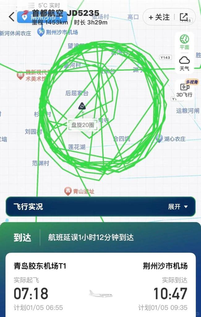 该航班是从青岛飞往南宁,并计划中途在荆州经停。根据飞行平台的信息显示,飞机在湖北荆州上空开始盘旋,进入了“绕毛线”模式。