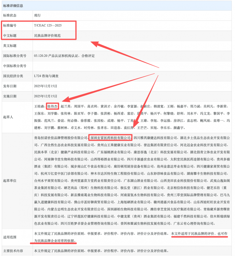 据了解,此次参与《民族品牌评价规范》制定,并非玄雷医药首次涉足标准化工作。2025年7月,玄雷医药已成功入选《药食同源优选产品评价规范》《大健康产业科技创新体系评价规范》两项团体标准的起草成员单位,创始人张伟杰同时获聘两项标准起草组专家。