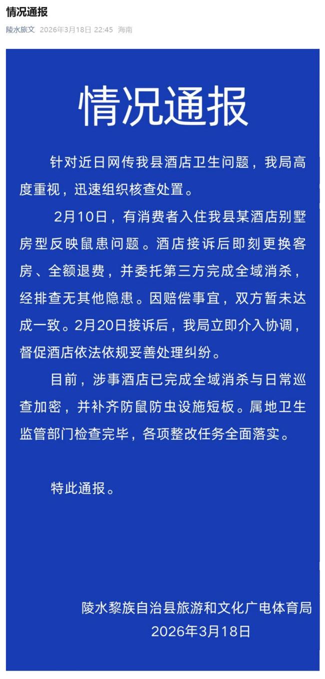 9800元1晚高档酒店现老鼠 当地通报 已全面整改消杀!3月18日晚,海南陵水黎族自治县旅游和文化广电体育局发布情况通报,针对近日网传该县酒店卫生问题进行了核查处置。