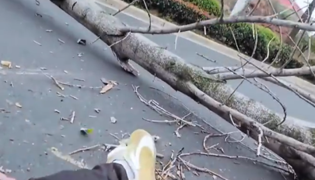 3月18日,江西兴国县将军大道中段绿化带一棵大树突然倒伏横卧马路,一名骑摩托车的市民紧急制动避险时摔翻在地。19日,目击者称倒伏的树木较大,骑车市民自行起身。兴国县城管局回应,系大风将树吹倒,接报后已移走倒伏树木,未接到砸中行人和车辆的报告。城管局人员称,骑车市民若未报保险,可用行车记录仪视频联系城管局处理。