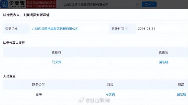 北京西贝腾格里餐饮管理有限公司最近进行了工商变更,马文宾卸任法定代表人和董事职务,由盛宏晓接替。今年1月,该公司也发生过一次工商变更,当时马文宾接任了法定代表人和董事的职位,其他高管也有所调整。该公司成立于2021年11月,注册资本为100万元,由内蒙古西贝餐饮集团有限公司全资持股,实际控制人为贾国龙。