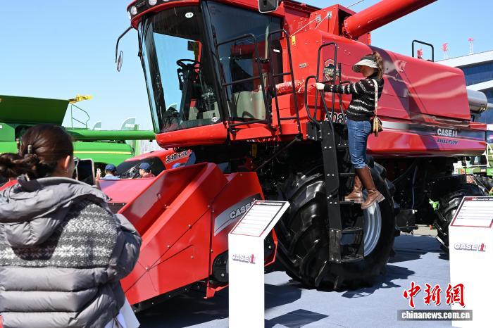 3月26日,内蒙古呼和浩特市,一位女士与农机合影。中新社记者 刘文华摄