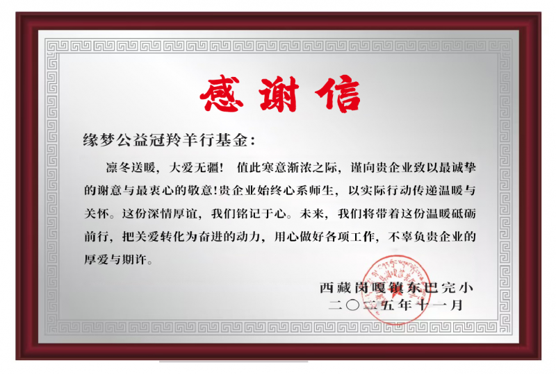 跨越山川之外,更有高原之上的坚守。冠羚羊行爱心代表克服缺氧、严寒与路途颠簸的重重考验,跨越4300米的高海拔,将定制保温杯、棉鞋及学生羊奶粉,送达海拔4382米的西藏定日县东巴完小。这里距离珠峰仅60公里,冬季气温低至零下30度,御寒物资紧缺。捐赠现场,孩子们换上崭新棉鞋,手捧温热的杯子,脸上绽放出质朴而灿烂的笑容。校方在感谢信中写道:“凛冬送暖,大爱无疆!”这份跨越山海的温暖,不仅是物质上的及时支援,更是精神上的有力鼓舞,在祖国边陲与内陆之间,悄然架起一座心手相连的温情桥梁。
