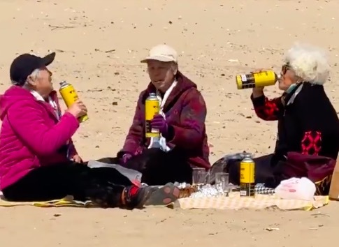 4月1日,山东烟台,女生在海边游玩时偶遇88岁奶奶带闺蜜们春游野餐,在海滩上点外卖点酒痛饮,还拍了美美的照片。