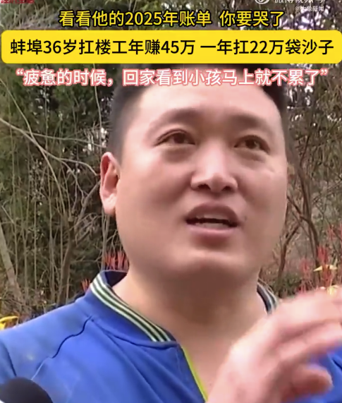 “一次搬两袋,两袋大概140斤,我现在差不多160斤多一点。”近日,安徽蚌埠的36岁扛楼工杨晨用铁肩扛起家庭重担。2025年,杨晨年收入超45万,如果用70斤一袋的沙包衡量,相当于一年跑二楼扛了22万袋沙子。“三四十摄氏度高温的时候,真的很...