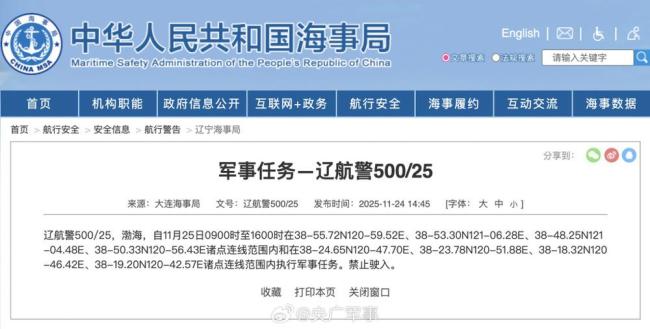 大连海事局发布航行警告,自11月25日9时至16时,渤海部分海域执行军事任务;自11月25日8时至28日12时,黄海北部部分海域实弹射击,禁止驶入