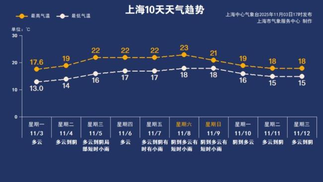 上海今天云系增多,以多云到阴为主,最低气温14℃,最高19℃,气温比昨日略有上升。建议注意补水润燥,并在早晚添衣保暖。本周气温逐渐回升,周末时最高气温将重回23℃左右