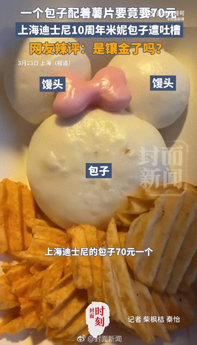 3月24日,上海迪士尼70元一个包子的定价引发网友热议,许多人认为价格过高。网友发布的图片显示,迪士尼十周年套餐包括一个形似米妮的蒸包子和若干薯片,售价70元。该网友表示,“米妮”包子头部有馅,味道像酱肉包,但耳朵部分没有馅
