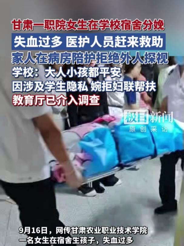 近日,甘肃农业职业技术学院一名女学生在学校宿舍分娩引发关注。9月13日,在该校1号公寓,医护人员怀抱新生儿,并用担架将女学生送至医院。学校党委委员、副校长马万锋表示,救治比较及时,目前母子二人身心状态良好