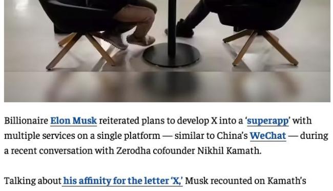 特斯拉首席执行官埃隆·马斯克在与Zerodha联合创始人尼基尔·卡马斯的对话中表示,他希望将社交平台X打造成中国以外的“微信升级版”,使其具备信息发布和金融支付等多种功能。这次交流是在播客节目“People by WTF”中进行的