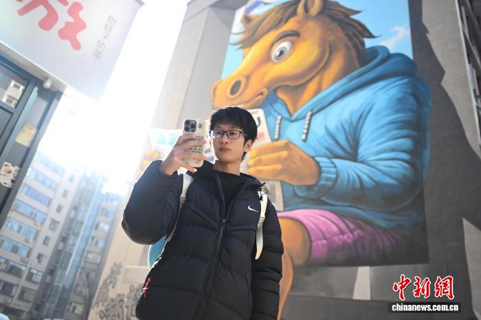 11月28日,在位于甘肃省兰州市城关区街头,游人在大型卡通“铜奔马”3D墙绘前拍照。中新社记者 李亚龙 摄