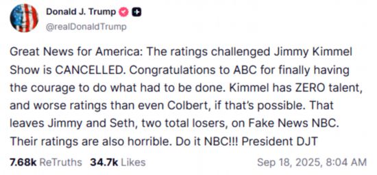 新华社北京9月18日电美国广播公司(ABC)17日宣布,将“无限期”停播主持人吉米·基梅尔的深夜脱口秀节目,原因是基梅尔在节目中对美国知名保守派活动人士查理·柯克遭枪杀事件发表的言论引发争议。停播决定
