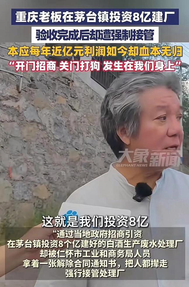 重庆老板唐显策响应茅台镇招商号召,投入8亿建成白酒废水处理厂。工厂刚有收益就被当地部门强制接管。尽管法院判定“解除合同通知书”无效,但三年过去,工厂仍未归还,唐显策血本无归。此事引发网友热议,有人痛斥“关门打狗”,也有人呼吁看完整细节