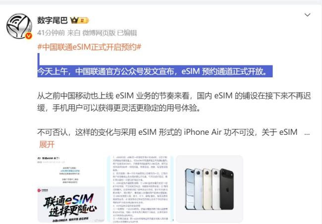 数码博主“数字尾巴”指出,eSIM技术将带来更灵活稳定的用号体验。中国联通开放预约标志着手机通信方式的重要变革。中国联通官方公众号于10月13日宣布正式开放eSIM业务预约通道。截至发稿时,预约人数已突破6万人,且数字仍在快速增长