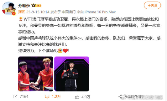 9月15日,孙颖莎发文:?WTT澳门冠军赛成功卫冕,再次踏上澳门的赛场,熟悉的氛围让我更加放松和专注。和曼昱的决赛一如既往的激烈和酣畅,每一分的争夺都很精彩,又是一次难忘的经历。感谢中国乒乓球队这个伟大的集体??,感谢我的教练、队友们,荣誉...