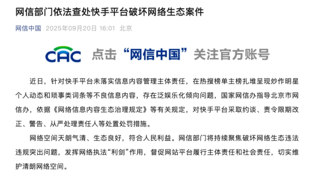 因破坏网络生态,快手平台被网信部门依法处置处罚